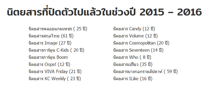 ตลอดระยะเวลา 1-2 ปีที่ผ่านมา คนที่อยู่ในแวดวงสื่อสิ่งพิมพ์ คงอดใจหายไม่ได้กับการจากไปของนิตยสารและหนังสือพิมพ์หลายฉบับ ไม่ว่าจะเป็น สกุลไทย อิมเมจ หรือแม้แต่หนังสือพิมพ์บ้านเมืองที่จะปิดตัวลงในวันใหม่ของปี 60 ท่ามกลางความเปลี่ยนแปลงของพฤติกรรมการบริโภคสื่อ คงไม่ต่างอะไรกับแม่น้ำที่เปลี่ยนสายและส่งผลกระทบโดยตรงกับผู้ใช้แม่น้ำสายเดิม