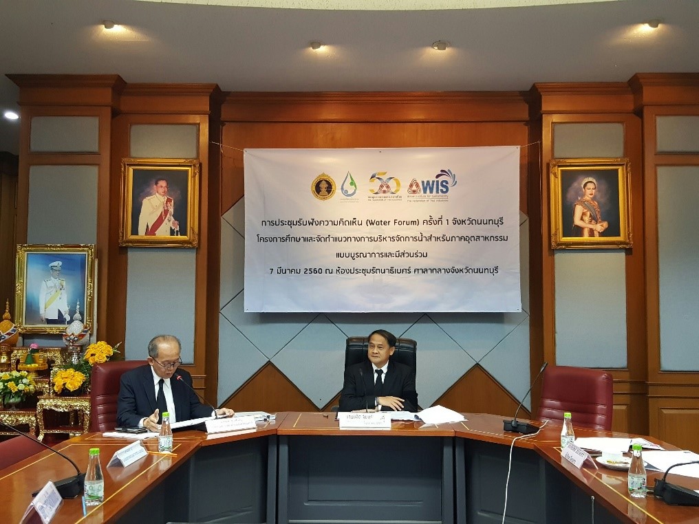 [1] เป็นโครงการศึกษาและจัดทำแนวทางการบริหารจัดการน้ำ สำหรับภาคอุตสาหกรรมแบบบูรณาการและมีส่วนร่วม หน่วยงานที่รับผิดชอบ คือ สถาบันน้ำเพื่อความยั่งยืน สภาอุตสาหกรรมแห่งประเทศไทย มีพื้นที่นำร่องจำนวน 14 จังหวัด ได้แก่ กรุงเทพมหานคร ปทุมธานี นนทบุรี นครปฐม สมุทรปราการ สมุทรสาคร พระนครศรีอยุธยา ราชบุรี กาญจนบุรี สระบุรี ลพบุรี อ่างทอง สิงห์บุรี และชัยนาท มีวัตถุประสงค์ เพื่อการศึกษา ข้อมูลสถานการณ์การใช้น้ำของภาคอุตสาหกรรม แหล่งน้ำ ผิวดิน แหล่งน้ำบาดาล รวมทั้งความต้องการในการใช้นำในภาคส่วนต่าง ๆ เพื่อนำมาจัดทำแผนบูรณาการร่วมกันในการแก้ไขปัญหาเรื่องน้ำ