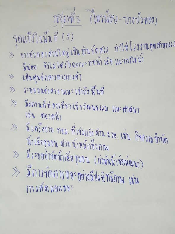 - จุดแข็งของนนทบุรี คือ เป็นเขตของชลประทานเต็มพื้นที่ มีน้ำในพื้นที่ตลอด แต่ที่เป็นปัญหา คือ การจัดการน้ำ ในภาคการเกษตร