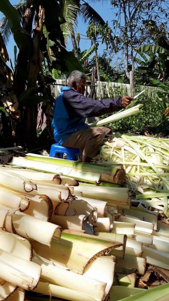 จากนั้นใช้กาบที่ 2-5 ลอกเนื้อด้านในออก นำไปผึ่งให้แห้ง...ส่วนใบตองที่ปล่อยให้แห้งคาสวนให้นำมาทำความสะอาด