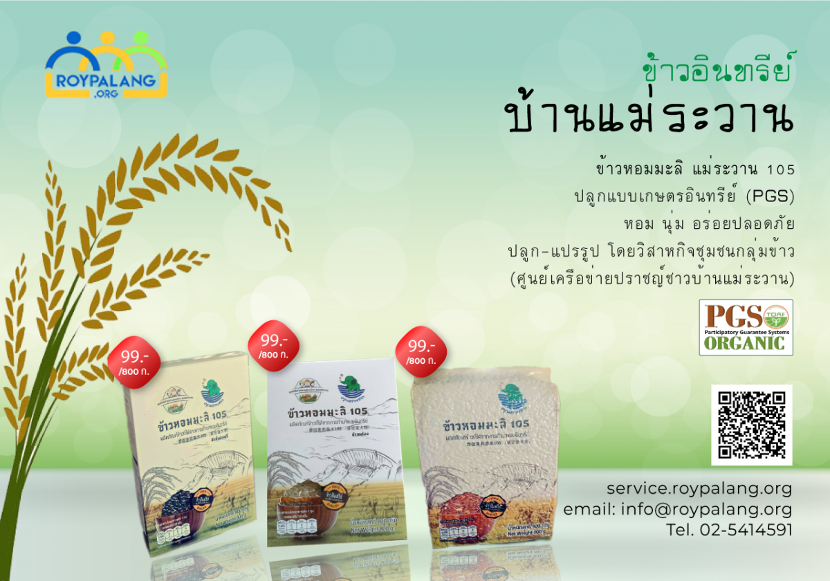 เป็นข้าวหอมมะลิ 105 ปลูกแบบเกษตรอินทรีย์ (PGS) หอม นุ่ม อร่อย ปลอดภัย ปลูก-แปรรูป โดยวิสาหกิจชุมชนกลุ่มข้าว (ศูนย์เครือข่ายปราชญ์ชาวบ้านแม่ระวาน)