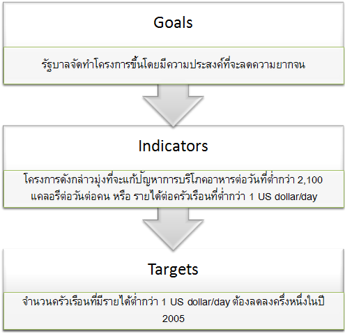 การวัดผลของการดำเนินงานที่แสดงค่าความหมายที่สัมพันธ์กับระหว่างผลผลิต ผลลัพธ์ และผลต่อเนื่อง ในที่นี้จะขอยกตัวอย่างให้ต่อเนื่องจากเรื่องของการทบทวนวัตถุประสงค์และเป้าหมายของการดำเนินงานข้างต้น