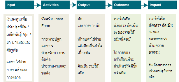 สมมติว่า บริษัทฯจะจัดทำโครงการเพื่อสนับสนุนการแก้ไขปัญหาความยากจนของประชาชนในเขตพื้นที่ชนบทที่มีรายได้ครัวเรือนที่ต่ำกว่า 1 US$/day ด้วยโครงการส่งเสริมการปลูกผักเพื่อขายส่งร้านค้าย่อยในตลาด ซึ่งเป็นโครงการประเภทสร้างรายได้เพิ่ม