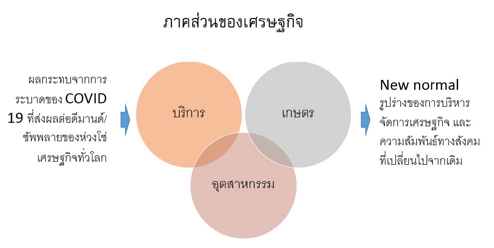 ผลกระทบต่อเศรษฐกิจและสังคม จากการระบาดของ COVID 19 ทำให้โลก ตกอยู่ในสภาวะการชะงักงันไปตามมาตรการข้างต้น ส่งผลโดยตรงต่อวงจรเศรษฐกิจของภาคบริการ เป็นลำดับแรก และส่งผลต่อภาคอุตสาหกรรม และเกษตร เป็นลำดับถัดมา