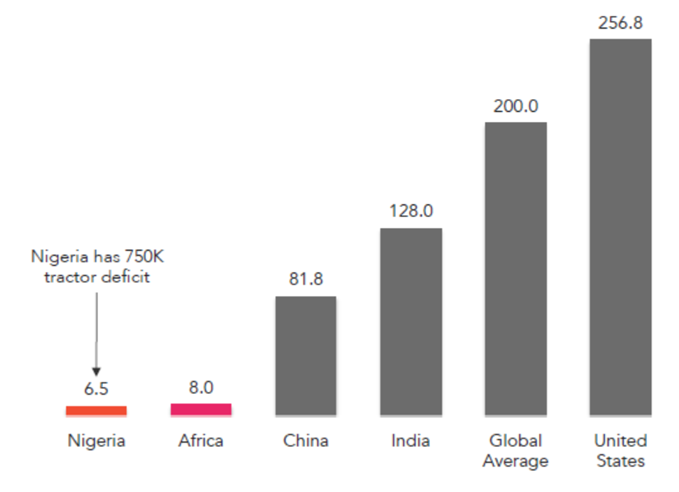 Hello Tractor เป็นกิจการที่จัดตั้งขึ้นในเดือนมิถุนายน ปี ค.ศ. 2014 เป็นผลงานจากการริเริ่มของ Jehiel Oliver ที่นำเอาความสามารถในการให้บริการของ ICT-Digital เข้ามารองรับกลไกการทำงานของ Application เพื่อให้บริการที่ไนจีเรียในรูปแบบเดียวกับการบริการของ Uber หรือ Bolt เพื่อบริการรถยนต์บ้านที่ยินดีให้บริการเป็นแท็กซี่ในสหรัฐอเมริกา Grab ที่ริเริ่มพัฒนาจากบริการของแท็กซี่ที่เป็นแท็กซี่คุณภาพและปลอดภัยในเอเชียตะวันออกเฉียงใต้ และ Didi ในจีน แต่บริการของ Hello Tractor ไม่ใช่บริการแท็กซี่เพื่อการเดินทาง แต่เป็น Tractor สำหรับเป็นเครื่องจักรกลการเกษตร (ลงทุนแมน, 2021) ทั้งนี้ก็เพราะว่า ไนจีเรียและแอฟริกามีความต้องการ Tractor เพิ่มเติมอีกมาก หากเปรียบเทียบกับภูมิภาคอื่น โดยค่าเฉลี่ยของการมีบริการ/การใช้งานของ Tractor ต่อพื้นที่ 100 ตารางกิโลเมตรของโลกมีค่าเฉลี่ยอยู่ 200 คัน แต่ที่แอฟริกาและไนจีเรีย มีเพียง 8 คัน และ 6.5 คัน ตามลำดับ ดังที่ปรากฎตามรูปที่ 4.10 ยิ่งไปกว่านั้น ภาคเกษตรของแอฟริกาและไนจีเรีย ยังเผชิญกับการแย่งชิงแรงงาน อันเนื่องมาจากการขยายตัวอย่างรวดเร็วของเมืองและแรงงานสูงวัย (Oliver, 2019)