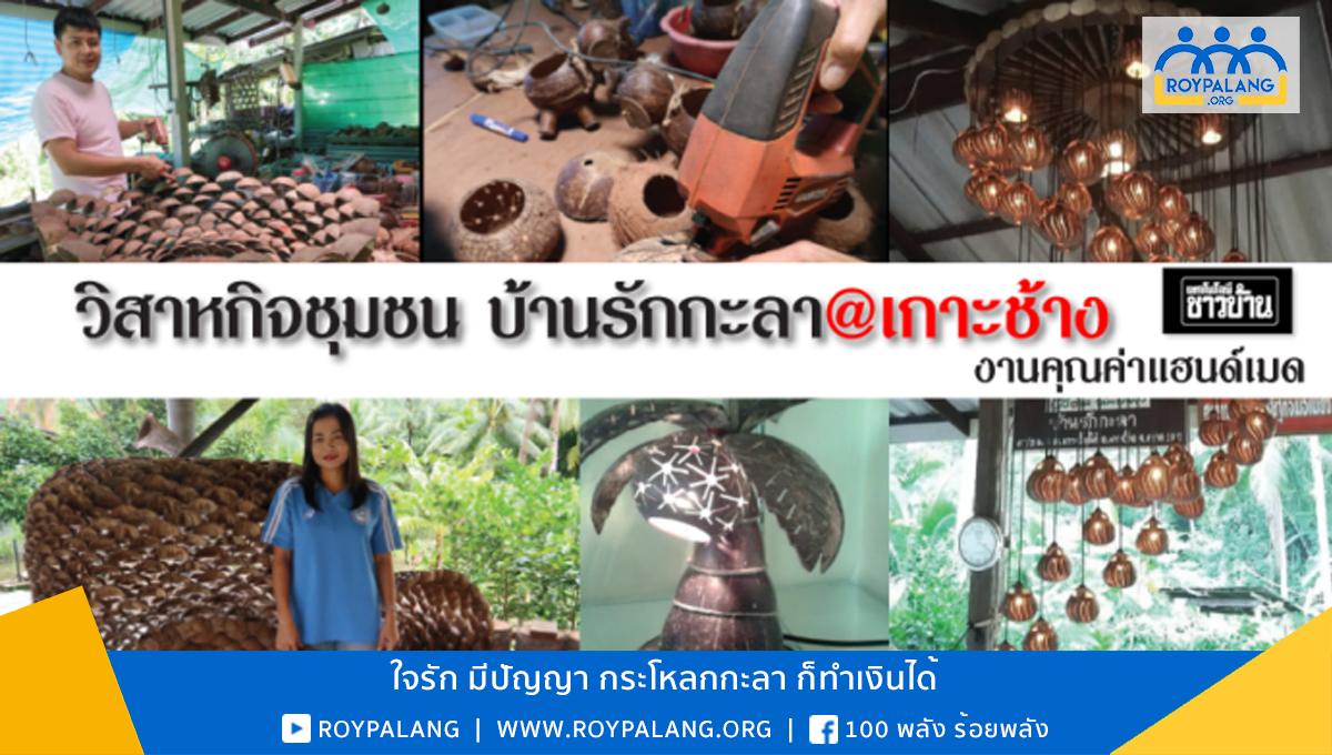 สามีภรรยา คุณพงษ์ศักดิ์ สวัสดิผล อาชีพช่างไฟฟ้า ทำนากุ้ง และรับจ้างขุดแบ๊กโฮ คุณน้ำค้าง กุศลจิต หรือ คุณก้อย อาชีพเดิมรับตัดเสื้อผ้า ภูมิลำเนาเป็นคนเกาะช้าง เห็นกระโหลกกะลามะพร้าวถูกทิ้งหรือนำไปเผาทิ้งเกิดเสียดาย จึงคิดนำกะลามาประดิษฐ์เป็นเครื่องประดับ เครื่องใช้ ของที่ระลึก เพื่อสร้างมูลค่าเพิ่มและสร้างรายได้ให้กับชุมชน เพราะเกาะช้างเป็นเมืองท่องเที่ยวมีนักท่องเที่ยวต่างชาติจำนวนมาก จึงเริ่มต้นจากการก่อตั้งวิสาหกิจชุมชน บ้านรักกะลา เกาะช้างใต้ จากนั้นจึงเริ่มทำผลิตภัณฑ์ จำหน่ายที่ “บ้านรักกะลา” แรกๆ มีสมาชิกเริ่มต้น 4-5 ราย แบบมีไม่ถึง 10 แบบ ปัจจุบันมีสมาชิก 20 รายแบบมีกว่า 100 แบบ   และมากกว่า 1,000 ชิ้น ราคาเริ่มจากชิ้นละ 15 บาทไล่ขึ้นไปเรื่อยๆ ตามความยากและขนาด ของผลิตภัณฑ์สูงถึง 15,000 บาท ราคาแพงสุดขณะนี้คือโคมไฟชุดพิเศษมีราคา 30,000 บาท เป็นโคมไฟติดเพดานขนาดใหญ่ทำเพียงชิ้นเดียว
