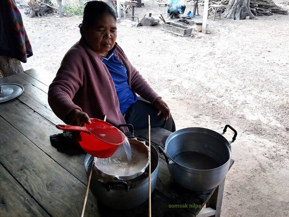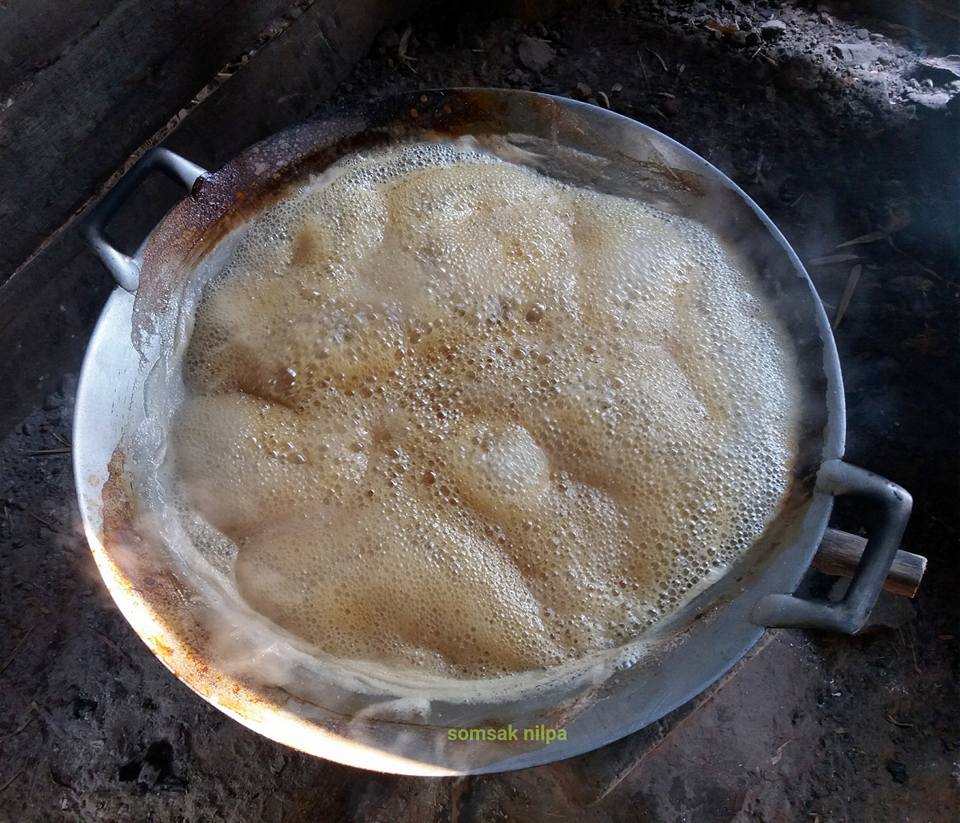 ตาหว่อ นำน้ำตาลสดที่ได้มากรองด้วยผ้าขาวบาง เพื่อให้ได้น้ำตาลที่สะอาดบริสุทธิ์ จากนั้นก็เตรียมติดเตาถ่านจากฟืนแห้ง หรือก้านตาลแห้ง อันเป็นเสน่ห์อีกอย่างของการทำตาลโตนดแบบโบราณ ติดไฟไว้พร้อมแล้ว น้ำตาลสดรองผ้าขาวบางเรียบร้อย จากนั้นก็ตั้งกระทะใบใหญ่ เทน้ำตาลลงไปแล้วค่อยๆเคียว ทำอย่างใจเย็น โดยใช้ไม้พายคนให้ทั่วกระทะ จนได้ที่ รวมๆเวลาก็หลายชั่วโมงพอควร