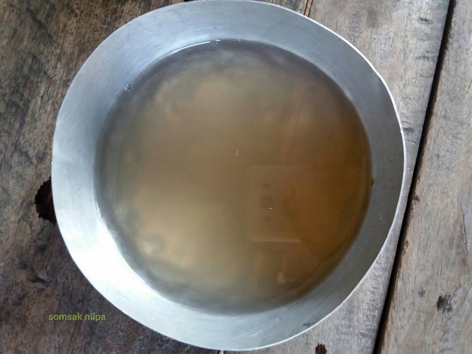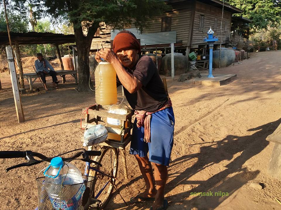 ตาหว่อ ให้ลองชิมน้ำตาลสดๆ หลังจากที่ลงจากต้น โดยเทน้ำตาลจากขวดพลาสติกใส่ลงในขันอลูมิเนียมโบราณ ซึ่งมีคุณสมบัติเก็บความเย็นได้ดีระบายความร้อนได้เร็ว รสชาติน้ำตาลสดจากโคนต้นจึงหวานหอมเย็นชื่นใจเกินบรรยายเชียวละ ยิ่งบรรยากาศบ้านทุ่งด้วยแล้ว ได้ทั้งรสชาติและอรรถรสพร้อมๆกัน
