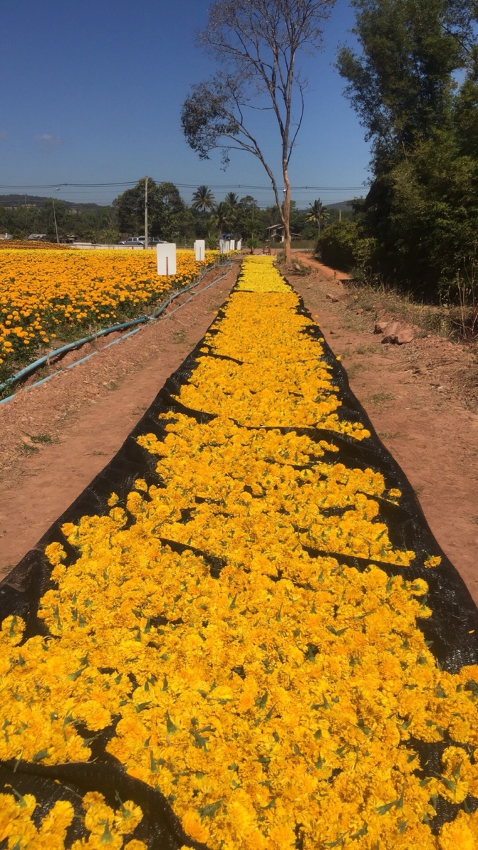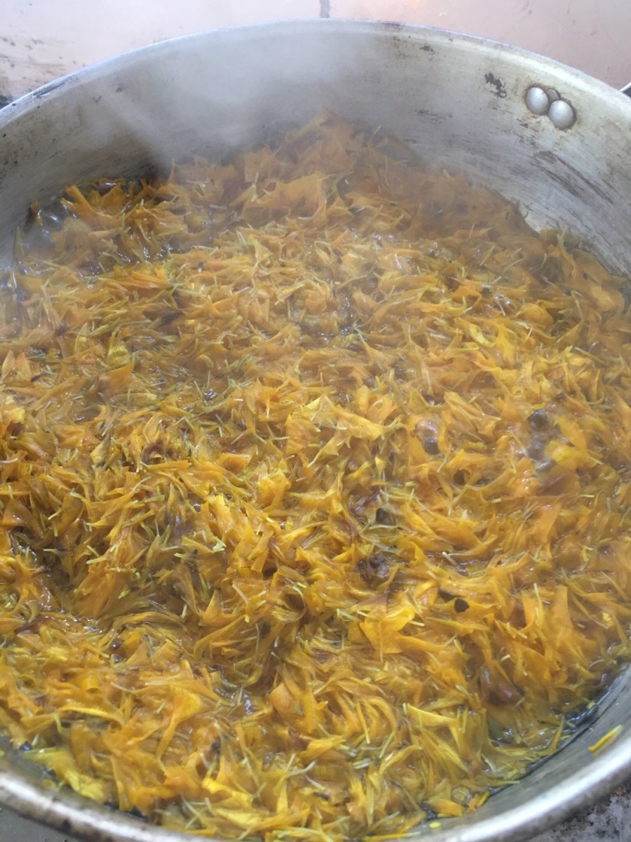 - เติมดาวเรืองถ้าดอกแห้งประมาณ 1 กก. (ถ้าใช้ดอกสดแกะดาวเรืองเอาเฉพาะส่วนกลีบใช้ประมาณ 2 กก.)